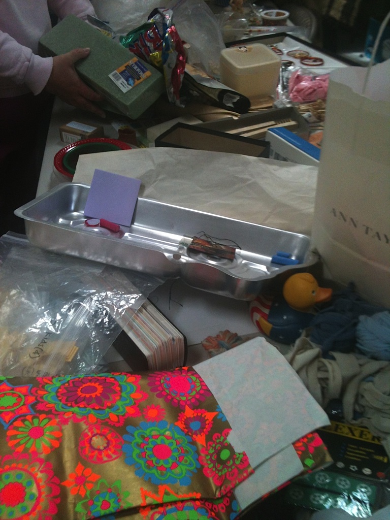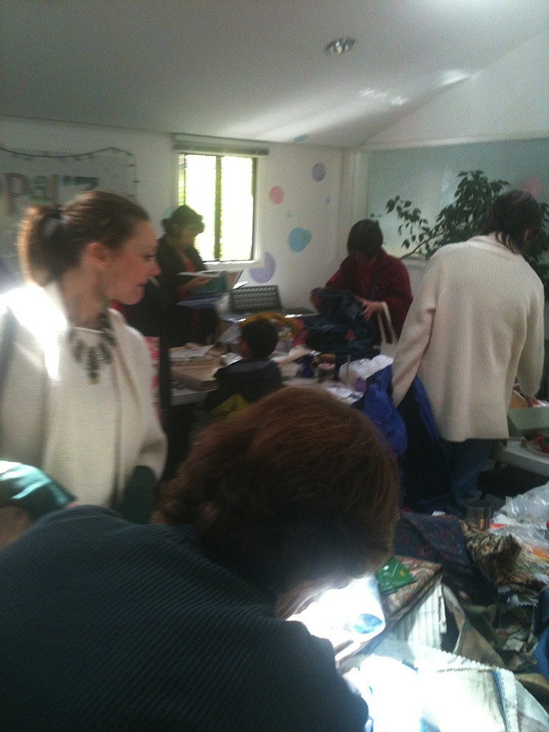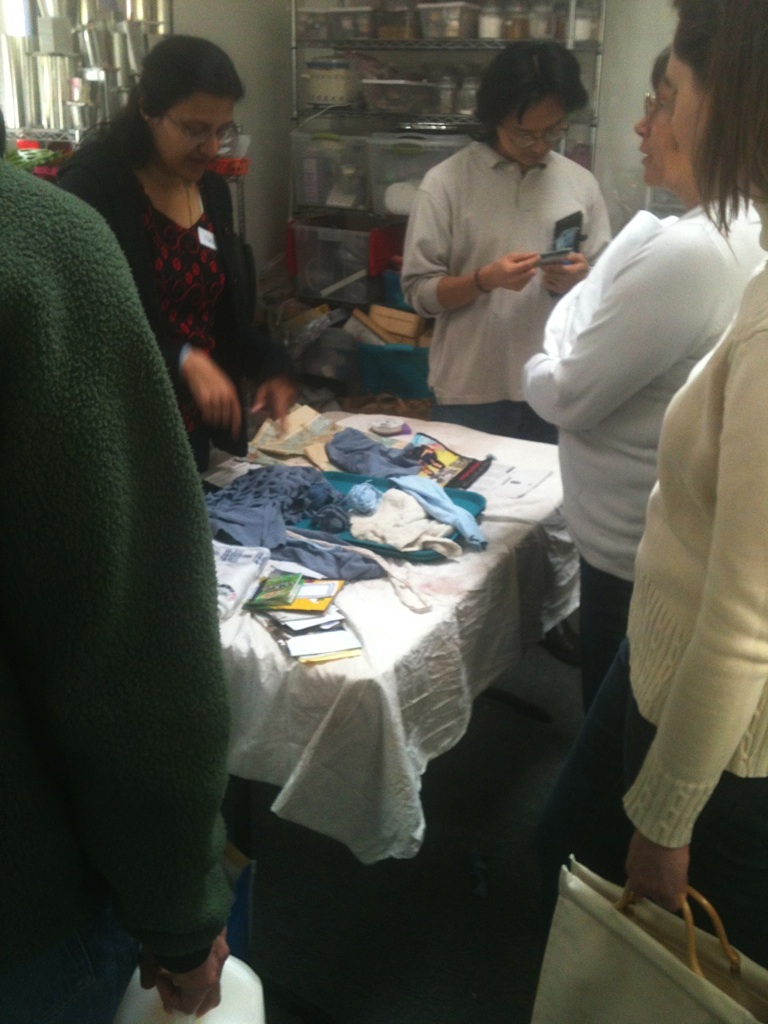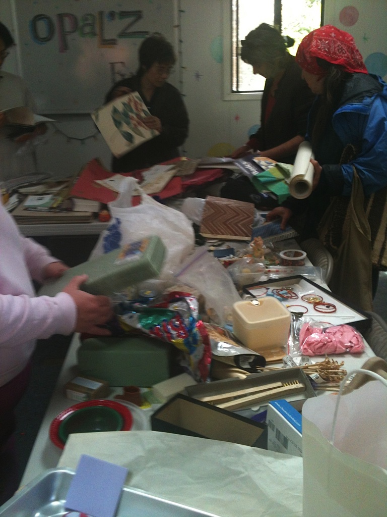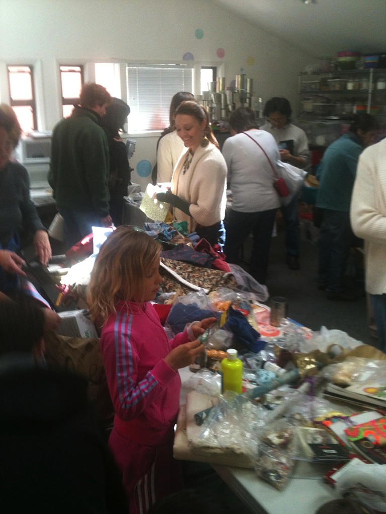 Sunday, March 18th at Opal’z in Midtown Palo Alto, a record (approximately) 50 people converged on the upstairs room, normally reserved for birthday parties and soap-making. Instead, these locals were armed with bags of fabrics, paints, papers, ornaments and all sorts of arts and craft supplies. The attendees were eager to swap and jumped in to sort through the piles and boxes of a huge variety of items. Yarns and needles quickly disappeared, the prettiest fabrics snatched up, scrapbooks and more found new homes and luckily were saved from the landfill. The aromas of Annie (Opal’z proprietor)’s fragrant soaps filled the air as people shared stories and filled bags.