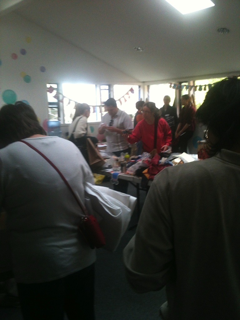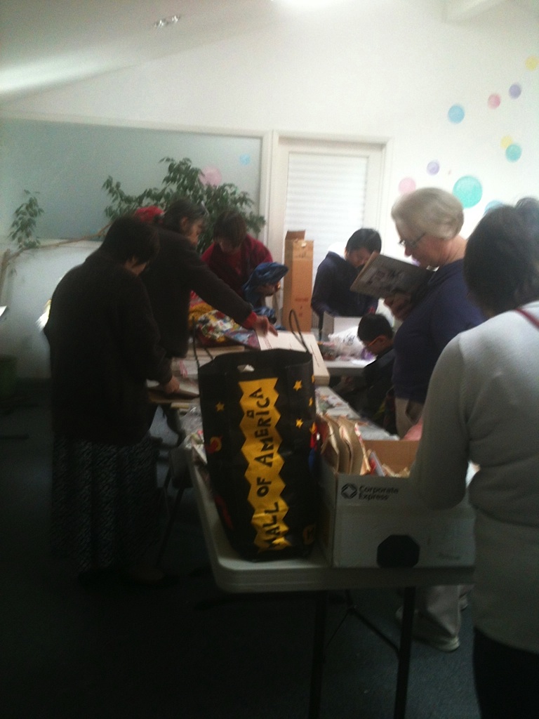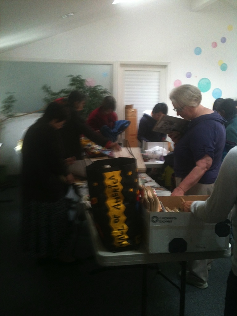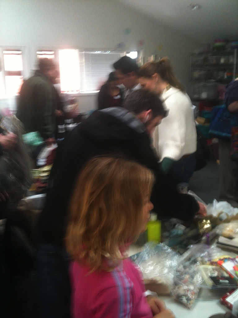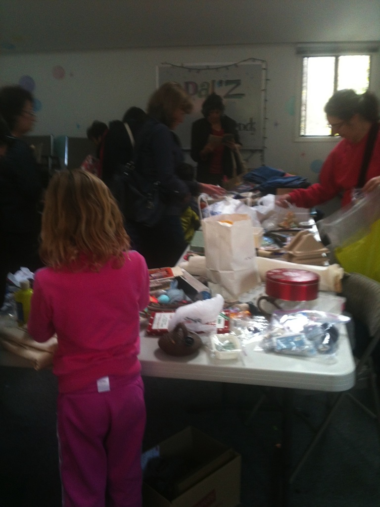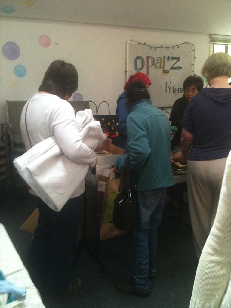 Sunday, March 18th at Opal’z in Midtown Palo Alto, a record (approximately) 50 people converged on the upstairs room, normally reserved for birthday parties and soap-making. Instead, these locals were armed with bags of fabrics, paints, papers, ornaments and all sorts of arts and craft supplies. The attendees were eager to swap and jumped in to sort through the piles and boxes of a huge variety of items. Yarns and needles quickly disappeared, the prettiest fabrics snatched up, scrapbooks and more found new homes and luckily were saved from the landfill. The aromas of Annie (Opal’z proprietor)’s fragrant soaps filled the air as people shared stories and filled bags.