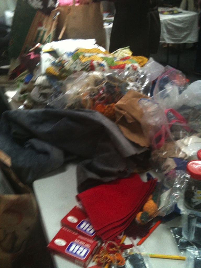 The crowd was such that there was a high, steady, hum through the room, and we limited the demos to only paper beads and a few things that can be made from a tshirt, leaving Annie’s other demos for future swaps. There was still a lot of stuff left over at the end (in the future, please remember to stay to take home your extras!), so crafters, teachers, families, and artists can look forward to more supplies at the next Craft swap, to be shared with the Garden Share on May 13th, 11am at Common Ground.