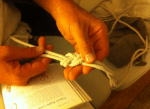 Monica sewed cloth napkins, Roy and Barbara sketched and cut out letters for the new Transition Palo Alto banner, Emily sewed cloth heat pads (to be filled with rice), William experimented with knots, and Herb supplied mellow background music.