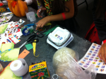 While all the costume bringing, taking and trying on was going on, creativity positively oozed at the recycled crafts table. Armed with nothing but old containers, scraps of packing peanuts, fabric, yarn, hole punchers, and markers, kids created disgusting delicacies perfect for the season: Eyeballs of lizard (yum!), dragon take-out, dragon intestines, crabs’ claws, and even some ghost poop. One father reminded his son that their family is vegetarian, so he won’t be able to put the crabs’ claws on his peanut butter sandwich. But they looked so delicious!